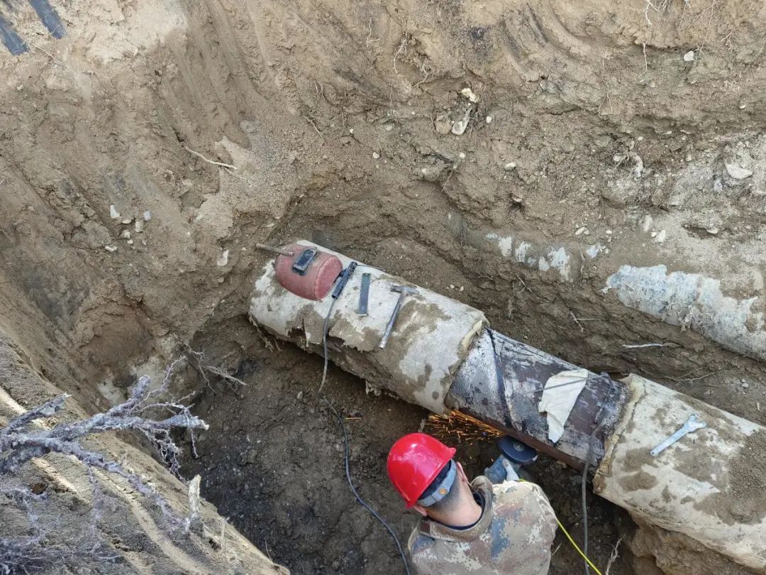 隨著破土作業(yè)的不斷推進(jìn),終于發(fā)現(xiàn)了漏點(diǎn)位置位于回水管道下方,但由于漏點(diǎn)裂口小且壓力大,給搶修工作增添了難度,經(jīng)過補(bǔ)焊、包套處理······該處漏點(diǎn)被成功修補(bǔ),高效完成了搶修任務(wù),恢復(fù)了正常供熱。
